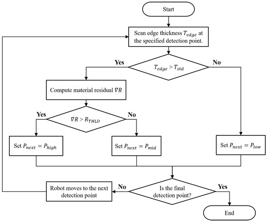 The robotic grinding compensation strategy can be divided into two stages: (1) vision sensor detection and (2) grinding compensation. In order to conduct the grinding compensation processes for those workpiece sub-areas which have not met the machining requirement, the laser-vision sensor is employed to determine the practical workpiece’s material residual, as shown in Figure 2. The distribution of the trajectory points, detection points, and corresponding boundaries is shown in Figure 2a, and the edge thickness can be computed in the profile data acquired from the laser-vision sensor, as shown in Figure 2b. The current workpiece’s edge thickness and material residual at each detection point are determined before applying the grinding compensation, then the operating pressure of the pneumatic cylinder for grinding each detection point’s corresponding area is evaluated according to the determined material residual.