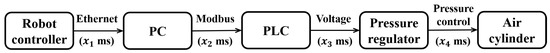 Figure 3 illustrates the flow chart of the vision sensor detection process for sensing the material residual of the workpiece at specified detection points, and the corresponding operating pressure is defined according to the determined material residual. After every operating pressure at each detection point’s corresponding area is defined and saved into a control table, the grinding compensation will be carried out by employing these calculated values to adjust the operating pressure of the pneumatic cylinder step by step. The flow chart of the grinding compensation process is shown in Figure 4. Firstly, the planned robotic grinding trajectory is conducted. The switch signals will be transmitted in turn from the robot controller to the when the robot reaches the boundaries of the detection points, then the defined value will be sent from the to the to control the operating pressure. The output pressure is adjusted by the electronic regulator according to the output voltage changed using the . Finally, the pneumatic cylinder’s output force is alternated immediately after the pressure is regulated by the electronic regulator. It is worth noting that the output pressure must be adjusted before the robot reaches the next trajectory point. Hence, the total operation time of changing the output pressure is considered important in multi-device communication and the robot’s motion velocity, as shown in Figure 5. The transmission time communication from the robot controller to the electronic regulator, computed by the term , must be less than the time taken for the robot to reach the next trajectory point.
