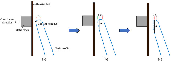 Figure 6 illustrates the improved grinding compensation process for sharpening the blade-shaped workpiece with the self-designed compliance mechanism. The contact force between the workpiece and abrasive belt is passively controlled to be constant through the compliance mechanism according to the characteristics of the pneumatic cylinder referred to in Equation (1). In addition, the small constant force deviation is acceptable because the machining accuracy can be ensured with the applied iterative grinding compensations. Therefore, the effects of the small grinding force fluctuation and unpredictable abrasive belt wear are negligible. However, the stress suffered on the contact area of the workpiece is an important factor affecting the grinding performance. As shown in Figure 6a, the contact situation is close to the point contact before applying any grinding compensation. Thus, the cutting depth is relatively deeper after the initial grinding trajectory due to the higher contact stress applied to the contact area. The contact area A of the workpiece gradually becomes bigger after each time the grinding process is completed, as shown in Figure 6b,c. Therefore, a lower cutting depth will be made during the following grinding compensation, even if the output contact force and air pressure are kept. When the machined is close to the required , the cutting depth caused by the grinding compensation is relatively decreased due to the higher contact area. The severe over-grinding phenomena can be proven by changing the into the lower pressure . Furthermore, the values of and are adjusted to strengthen the weakened grinding force due to the uncontrollable abrasive belt wear to ensure the machining efficiency in long-term machining production.
