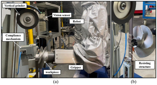 Experiment setup of the intelligent robotic grinding system for sharpening propeller blades. (a) With compliance mechanism. (b) Without compliance mechanism.