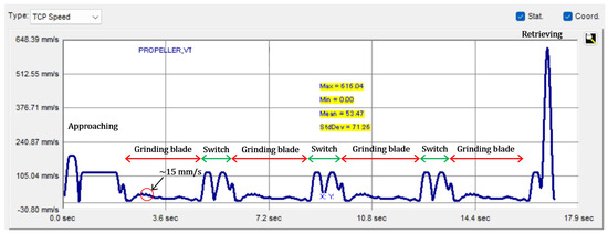 The relative setting parameters used in the robotic grinding experiment are shown in Table 2. It is worth noting that the faster the robot feed velocity of 100 mm/s is used in the grinding experiments. However, the practical robot velocity cannot reach the setting value when the motion continuity rate is involved. In addition, the test workpieces are the four-blade propellers, with 25 trajectory points are distributed evenly on each blade edge, as shown in Figure 2a. The interval distance between any two neighbouring points is around 2.5 mm to 3.5 mm according to the size of the workpiece model. Considering the effects of the point interval and motion continuity rate, the motion analysis of a planned robotic grinding trajectory for sharpening the propeller blades is shown in Figure 10. It is apparent that the reachable maximum velocity of grinding the propeller blade is around 15 mm/s to 17 mm/s, and the velocity of 100 mm/s is reached in the switching transition of blades to save time.