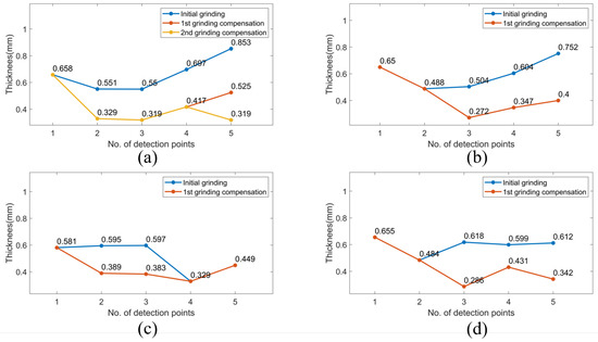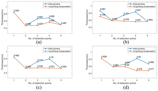 The iterative grinding compensation process for sharpening blade thickness of a large model. (a) blade No. 1 (b) blade No. 2 (c) blade No. 3 (d) blade No. 4.