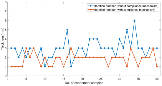 Figure 16 compares the machining efficiency according to numerous experiments conducted with and without the compliance mechanism. The iteration number of the grinding compensation process in each experiment is recorded. In addition, the test workpiece in the experiments was the medium propeller model and the abrasive belt was not replaced. We found that the robot needed one-six iterations to complete the entire grinding process to sharpen the propeller blade without the compliance mechanism, with a maximum of six iterations. The machining efficiency was improved by introducing the compliance mechanism as several processing uncertainties were eliminated during the grinding process. For example, the workpiece could be steadily machined in the initial grinding and compensation stages because the pneumatic cylinder was employed to adaptively adjust the contact position and provide a constant force, even though the unexpected variation in the curvature of the workpiece and improper longitudinal feed parameter were involved. To compare the experiments carried out with the compliance mechanism, the robot may need one-three iterations, with a maximum of three iterations, less than without the compliance mechanism. Our study demonstrated a substantial 40% increase in the machining efficiency by implementing the compliance mechanism. This enhancement was supported by a significant difference in the average number of iterations required with and without the compliance mechanism, 1.8 and 3, respectively.
