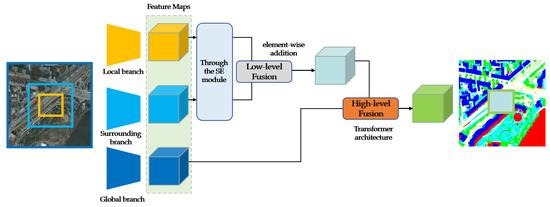 Figure 2 illustrates the structural design of the proposed model. The input image is divided into three parts, and the local branch of the model takes a specific region of the image as its input. The region is enlarged, and its environmental image is captured and used as input to the surrounding branch, which is twice the input range of the local branch. The global image is used as input to the global branch. First, the inputs to the local and surrounding branches are fused, and the processed regional image and its surrounding image are fused through low-level fusion using the SENet [31]. Then, the output result of the low-level fusion is fused with the input image of the global branch, which is through high-level fusion based on the transformer [36]. Finally, the output result is convolved to obtain a high-precision semantic segmentation image that covers the same region as the local branch.