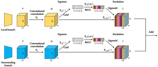 For this network, both the local branch and surrounding branch are independently inputted, each with a spatial dimension of w × h. These input elements undergo convolution using conventional methods, transforming the number of feature channels from c1 to c2. The function is defined in Equation (1).