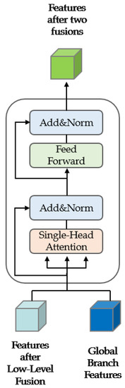 During the calculation of the attention value, Q, K, and V were replaced with our input images, namely, the features after low-level fusion and the global images input into the global branch. Within this process, the features resulting from low-level fusion are employed as Q, while the input from the global branch is used as K. The dot product of these two is computed, after which the low-level fused features and the input from the global branch are each utilized as V to perform two attention computations, effectively achieving two instances of self-fusion. The result of the dot product computation represents similarity, and a higher value corresponds to greater similarity and a heightened degree of attention. For general images, low-level features include edge and texture features, and global represents high-level features, i.e., category features. High-level fusion was carried out after the features in the two layers were placed in the same dimensional space through the self-fusion operation. The benefit of this method is that it can give the information regarding the intrinsic features more consideration and can prevent the final result from being completely dominated by a single feature due to the inconsistency of the dimensionality of the feature space.