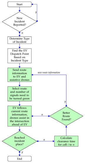 The emergency management system creates various priority codes (for instance, Code A, Code B, Code C) for different incident types. In a Code A scenario, an ambulance is allocated the highest priority (Priority 1), while fire services and police vehicles follow with Priority 2 and Priority 3, in that order. This arrangement is based on the need for an ambulance to be the first respondent at the scene for immediate patient care, followed by the police for incident evaluation. If necessary, fire services are dispatched to deal with potential hazards, such as an oil spill or a fire outbreak. Under Code B circumstances, a fire service vehicle gets top priority (Priority 1) since medical personnel can only assist the injured if the fire is dealt with first. This situation could occur when a vehicle is under fire and occupants are trapped within. For Code C incidents, a police vehicle is given the topmost priority (Priority 1), while the ambulance and fire service vehicles are assigned Priority 2 and Priority 3, respectively. This prioritization is typically for situations that require crowd management, like altercations between groups where a police presence is needed first to disperse the crowd, paving the way for the ambulance to reach the scene. After the emergency vehicle dispatch point and incident place are determined, the emergency control room and emergency vehicle determine the initial route using the emergency vehicle’s GPS []. Please note that the above steps are already used in the existing literature [] and the proposed approach uses the same method. The contribution of the proposed model starts from here and is highlighted in Figure 2. Any new incident in the path of the EV, change of incident (e.g., caught fire when there was no fire before the ambulance started its journey), and any other EV dispatch point is determined by the emergency controller. After an initial travel path for an EV is selected, this information is sent to the central traffic controller, who sends the information to the roadside infrastructure along the travel path and to the assistive drones with a permit to fly permission within the emergency vehicle route.