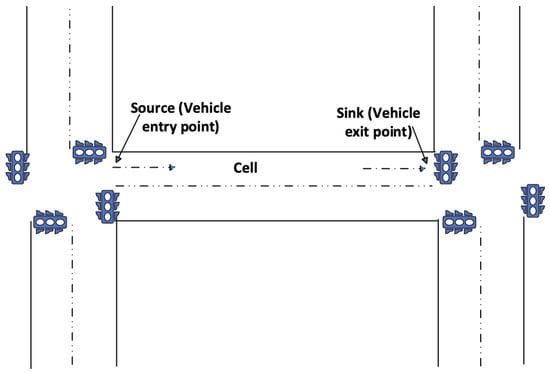 Algorithm 1 outlines the steps followed to determine the number of interruptions (signals need to be turned green) to find of best clearance time. The clearance time here includes the EV travel time to the incident location plus the time needed by other vehicles to clear the cell. In the context of traffic management and transportation research, a “Cell” refers to a distinct section or segment of a road that possesses a single entry point and a single exit point. Roads are divided into cells, where each cell represents a road segment with a designated vehicle entry point (referred to as the “source”) and an exit point (referred to as the “sink”), and there are no additional entry or exit points within the confines of that particular cell. Researchers have employed both fixed cell sizes [] and variable cell sizes [] in traffic queuing models. In our proposed model, we adopt the concept of variable cells in traffic modeling, which entails defining the road segment between two intersections as a cell (Figure 3).