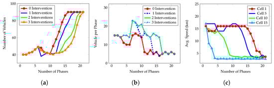 Figure 4a shows that density at Cell 10 started increasing from phase 9 when there was no intervention while the same was observed in phases 12, 15, and 16 for 1, 2, and 3 interventions, respectively.