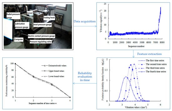 When analyzing the degradation process of bearings, the mathematical statistical methods generally assume that the amount of data are limited, and then extract characteristic parameters of bearings [8,9,10]. Based on the vibration signal collected, Ye et al. [11] used the maximum entropy method to calculate the PDF of bearings, which was regarded as degradation characteristics. Then, the Bayesian method, the bootstrap method and the maximum entropy method were fused to evaluate the reliability of bearings in service. Its performance degradation and reliability evaluation process are shown in Figure 1.