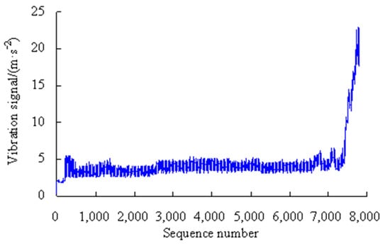 This is a strength lifetime test on the machine tool spindle bearings, which is conducted at a radial load of 4.58 kN, an axial load of 4.17 kN, and a motor speed 6000 r/min. The vibration acceleration sensor has a measuring range of ±2000 g and a resolution of 0.0001 g. The data-acquisition rate is 20 KHz. The test machine, the bearing used and the vibration data in this case are exactly the same as those of Case 1 in Reference [11]. The vibration signals are automatically collected by the computer control system, as shown in Figure 3.