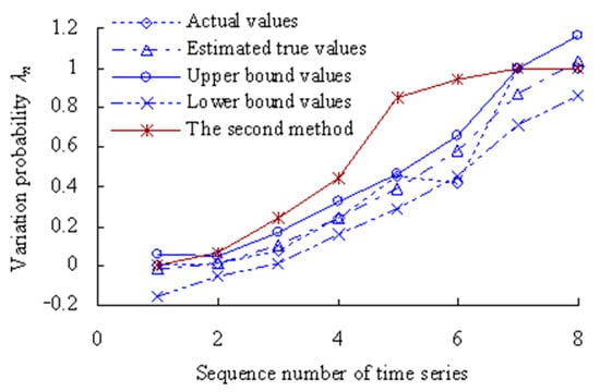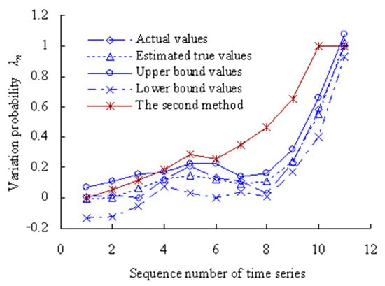 The maximum entropy method is used to calculate the probability density function of the generated sample YB. According to the probability density function, the true value and upper- and lower-bound values are estimated for the data sample of variation probability of each time series.