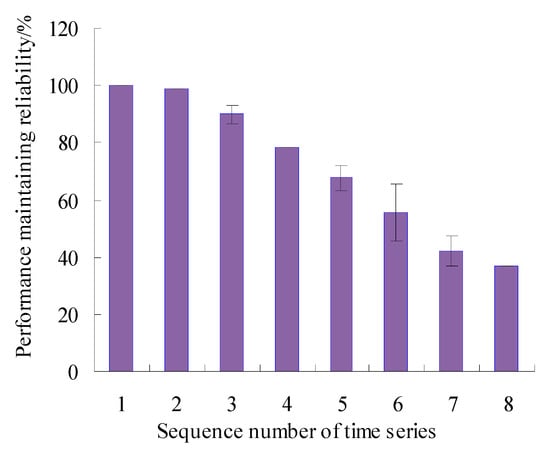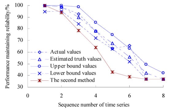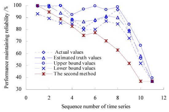 The upper- and lower-bound values of variation probability are applied into the reliability Equation (41), so the estimated true values R0 and upper- and lower-bound intervals [RL, RU] are gained for performance maintaining reliability during the time intervals corresponding to the performance time series. The range of variation probability λn is [0, 1]. 0 represents the OVPS of bearings without any variation, which is an ideal state and the reliability is 100% for bearing working at the OVPS. 1 represents that the OVPS of rolling bearings fail completely and the performance state is very unreliable. Therefore, if the value of λnL is less than 0, let λnL = 0 artificially in the process of solving the performance maintaining reliability.