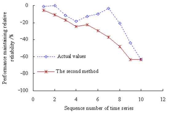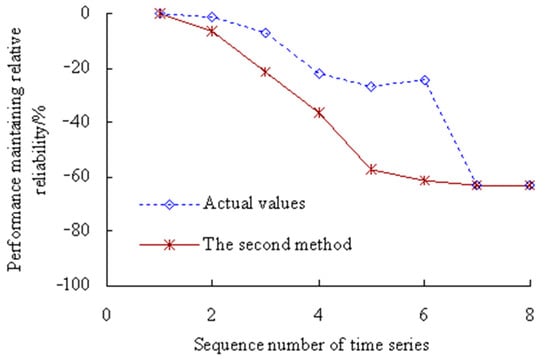 The negative value of d(λn) indicates the performance states has attenuation, namely, PMR currently is less than PMR during the optimum period, and the positive value indicates no attenuation. The smaller d(λn) is, the worse the performance states of MTSB is, and the larger the degree failure of OVPS is. Therefore, the time corresponding to d(λn) = −30%, is the critical time where OVPS becomes poor. Taking corresponding measures before the critical time can avoid serious safety accidents that are caused by the failure of OVPS.