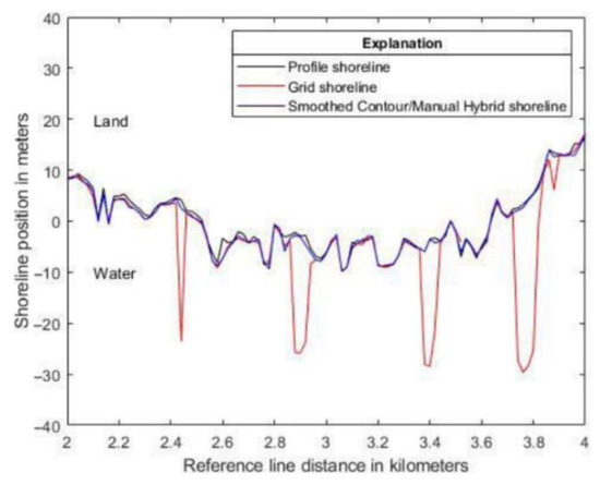 Comparison of the grid method, profile method, and the smoothed contour/manual hybrid method. The shoreline resulting from the use of the last method was obtained by smoothing the contour method, followed by manual editing and smoothing using a line smoothing tool in the ArcGIS software. The x-axis represents the distance along the shore. The y-axis represents the shoreline position. The position of the shoreline is provided in relation to the reference line. The obtained shorelines were rotated to facilitate the comparison of the differences [27].