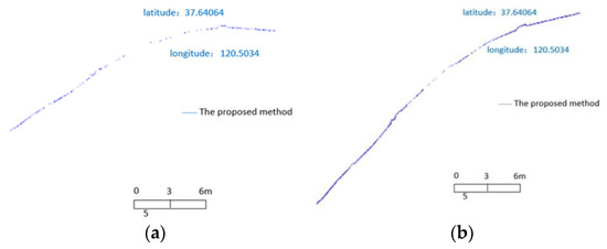 The steps described above were used to obtain a densified shoreline in the form of a point cloud. The densification result is presented above. The proposed method was compared with the contour method. Unfortunately, there seems to be no source of the reference method specified in the paper. There also seems to be no description of the method applied. Therefore, it is not certain what method is used exactly, although it is likely that either the method described by Farris et al. [27], or the one proposed by Liu et al. [29] is involved. A validation of the extraction results is limited only to the visual comparison of the results (Figure 5).