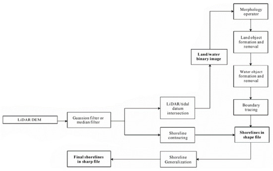As only LiDAR data fall within the thematic scope of this review, the focus is solely on the methods based on LiDAR. A diagram of the algorithm for LiDAR data is presented in Figure 6. The diagram includes two methods described in the study, i.e., the object-oriented method and the contour method [20,27]. In the object-oriented method, a cluster of land or water pixels is regarded as an object, while the shorelines are established as boundaries between the clusters of different classes. For the validation of the methods operating on the LiDAR data, the authors used the data collected using an ATM sensor. The authors performed a projection for the universal transverse Mercator (UTM) 15N reference system, horizontally referenced to the World Geodetic System 1984 (WGS 84) ellipsoid, with the North American vertical datum of 1988 (NAVD 88) vertical reference system.