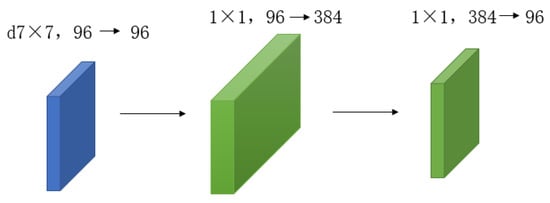 In contrast to conventional mainstream network models, the ConvNext network has implemented enhancements across various aspects encompassing the overall structure, deep convolution, inverted bottleneck, large convolution kernel, GELU activation function, and LN layer. Regarding the overall structure, the Stem layer of the ConvNext network employs a convolution kernel of identical size and a four-stride convolution operation akin to the Swin Transformer. As for convolution, the ConvNext network adopts the principle of deep convolution design, segregating the input and output channel quantities to diminish the parameter size of the designed deep convolution, which is significantly smaller than that of traditional convolution. Furthermore, ConvNext incorporates a bottleneck design akin to ResNet. Taking inspiration from the transformer network model, researchers fashioned the block module in ConvNext as an inverted bottleneck structure, resembling that depicted in Figure 5.