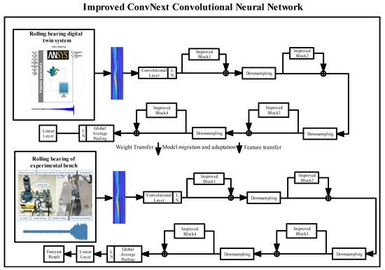 Lastly, this article presents a fault diagnosis model framework for rolling bearings, incorporating DT data, transfer learning, and an enhanced ConvNext network. More specifically, the DT system for the rolling bearing is established by constructing a coupled reduced-order model (ROM) that encompasses the multi-physics field of the main bearing. This model is utilized to enrich the sample dataset of the source domain by introducing different faults and altering various environmental parameters within a specific range. Subsequently, an upgraded version of the ConvNext network model is initially formulated and trained using the source domain dataset. The parameters and model of this improved ConvNext network are then transferred to the rolling bearing through weight and feature transfer. Ultimately, precise and accurate fault recognition of the defective bearing is accomplished through the utilization of the enhanced ConvNext deep learning network. The specific contributions are delineated as follows: