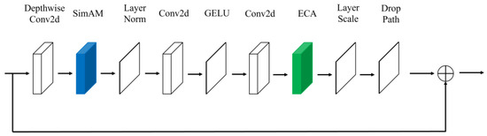 This article introduces an enhanced Block module within the ConvNext foundational network, referred to as the ECA-SimAM-ConvNext network model, illustrated in Figure 8. Recent research has shown that the inclusion of ECA and SimAM attention modules within the Block module significantly improves the model’s proficiency in extracting fault features from images. To be precise, the integration of SimAM and ECA attention modules enhances the model’s perception of crucial features, emphasizing essential fault characteristics while suppressing noise. This augmentation strengthens the network’s ability to represent features, thereby facilitating improved differentiation among various bearing states. Through the adaptive selection of frequency ranges or spatial regions of interest, the model can effectively capture signal information related to faults, thus enhancing its adaptability to different types of bearing faults and ultimately boosting generalization performance.