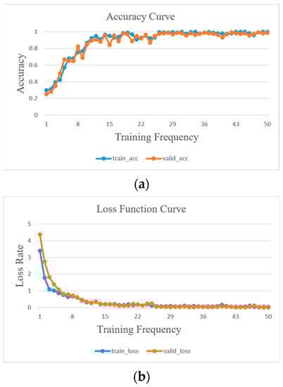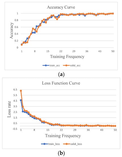Upon subjecting the training set data from Table 6 to 50 iterations of the training process using the proposed DT-TL-ECA-SimAM-ConvNext model, the accuracy and loss curves are visualized in Figure 16a and Figure 16b, respectively. Figure 16a exhibits a remarkably stable curve with minimal fluctuations, showcasing the accuracy of the validation set as being slightly below that of the training set. Simultaneously, Figure 16b signifies that the loss rate of the validation set marginally surpasses that of the training set, confirming the absence of overfitting and affirming the satisfactory training effectiveness.