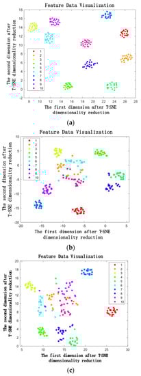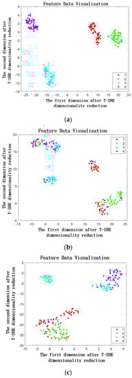 To present a more visually comprehensive demonstration of the proposed model’s adeptness in feature extraction, t-SNE, a machine learning algorithm employed for nonlinear dimensionality reduction and the visualization of high-dimensional data, was employed. By applying the t-SNE algorithm, the deep learning algorithm employed in this paper effectively reduced the high-dimensional fault features to two dimensions, showcasing them in the form of a scatter plot, as depicted in Figure 14.