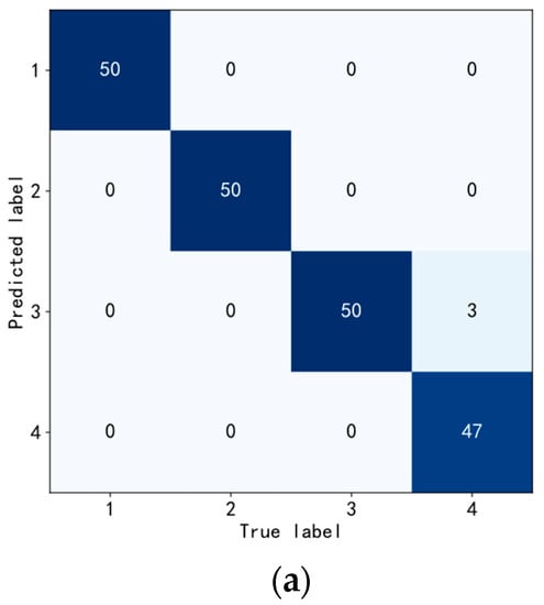 The accuracy and loss curves depicted in Figure 12 illustrate the outcomes of the DT-TL-ECA-SimAM-ConvNext model after 50 training epochs, utilizing the rolling bearing experimental sample data from Table 2. By the 40th epoch, the accuracy of both the training and validation sets showcased in Figure 12a had reached a flawless 100%, while the loss function value in Figure 12b had descended below the threshold of 0.01. Subsequently, the accuracy and loss curves demonstrated a gradual plateau, indicating the model had achieved a state of stable convergence. These findings conclusively establish that the proposed DT-TL-ECA-SimAM-ConvNext fault diagnosis model exhibited a commendable classification performance when employed with this experimental dataset.