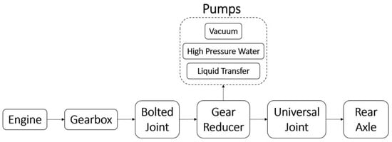 A schematic diagram of the transmission unit of the sewer cleaning vehicle under investigation is shown in Figure 1. The rotating joint to be examined consists of four bolts that connect the shaft at the output of the gearbox to the shaft at the input of the gear reducer, which supplies both the rear axle and the pumps. The main gearbox at the engine output consists of six gears. The vacuum, high-pressure water, and liquid transfer pumps are operated by engaging the fourth, fifth, and sixth gears at 720 rpm. These are the operating conditions under which it is necessary to detect the looseness of the bolted connection to avoid failures while the pumps are in use.