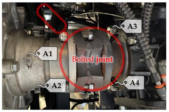 Figure 2 displays the experimental setup employed to fully capture vibrations related to periodic events caused by shaft rotations and gear angular velocity fluctuations under the selected operational conditions. Our assessment of the system’s response, measuring acceleration, focuses on two locations: one upstream and one downstream of the bolted joint. Two accelerometers (A1 and A2) are placed between the gearbox and the joint, while two others (A3 and A4) are placed between the joint and the gear reducer. The setup incorporates (i) four B&K 4535-B triaxial accelerometers and (ii) an LMS SCADAS Recorder 09 mobile PC-based multichannel analyzer platform, running the LMS Test.Lab 14A suite. This facilitates the acquisition and recording of time histories of the measured accelerations alongside the engine speed. All signals are simultaneously recorded in the time domain with a sampling frequency of 4096 Hz.