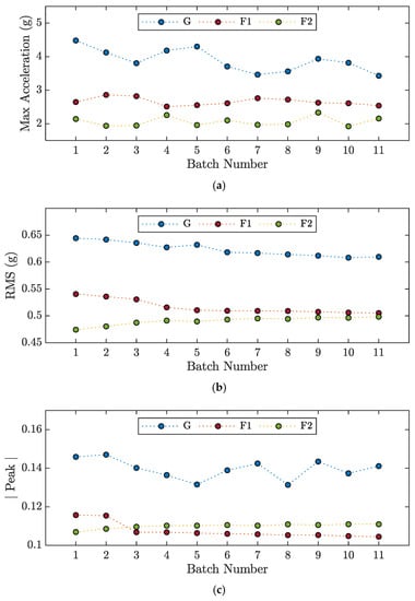 Features evaluated for each batch number of the signals recorded by accelerometer A1 along the x-axis during the experiments M4-G, M4-F1, and M4-F2: (a) Max Acceleration; (b) Root Mean Square; (c) Amplitude of the Peak in the frequency domain.