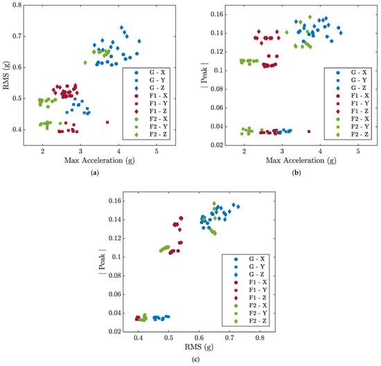 Two-dimensional scatter plots of the extracted features associated with the signals acquired from the X, Y, and Z axes of the A1 accelerometer during the M4-G, M4-F1, and M4-F2 experiments; (a) Max Acceleration-RMS; (b) Max Acceleration-Peak; (c) RMS-Peak.