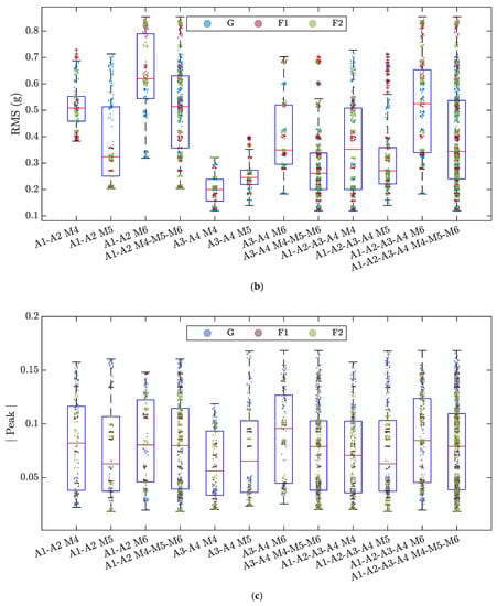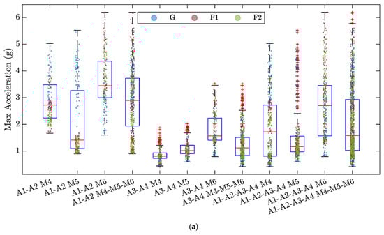 Boxplots of the data distribution of each feature for the 12 SVM models developed: (a) Max Acceleration; (b) RMS; (c) Amplitude of the Peak in the frequency domain. Red horizontal lines show the median of each distribution. From the box, whiskers extend to the most extreme observation within 1.5 times the interquartile range (equal to the distance between the 75th and 25th percentiles). Outliers are indicated by a red plus symbol. Within each boxplot, the corresponding data are illustrated and colored according to the three classes G, F1, and F2.