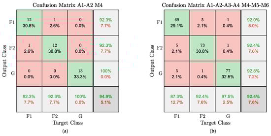 (a) Confusion matrix of model A1-A2 M4; (b) Confusion matrix of model A1-A2-A3-A4 M4-M5-M6; for each class, the precision scores are given in the rightmost column, the recall scores in the bottom row, while the overall accuracy is given in the bottom right box.