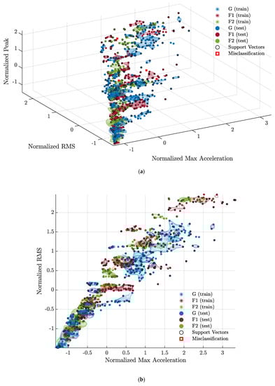 Figure 4 illustrates the feature space of the signals acquired from the X, Y, and Z axes of the A1 accelerometer during the M4-G, M4-F1, and M4-F2 experiments using two-dimensional scatter plots. From Figure 4, it is clear that the use of these features creates defined clusters of the different classes, but these clusters cannot be separated linearly, necessitating the use of a kernel such as RBF. Furthermore, considering the points relative to the z-axis of class F2 in Figure 4b,c, it can be seen that the soft-margin SVM approach is necessary to correctly handle misclassifications.
