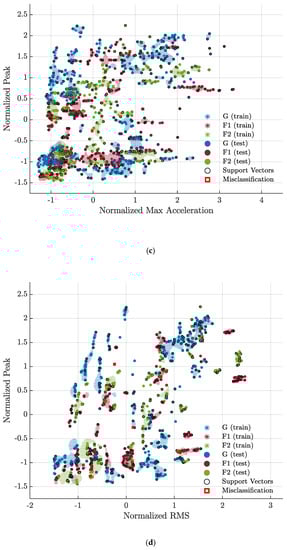Extracting features from raw signals is useful for algorithms such as SVM because it increases the separability of the different classes to be identified. Figure 3 shows the maximum acceleration, root mean square, and peak amplitude in the frequency domain calculated for different batches of signals acquired from the x-axis of accelerometer A1 during experiments M4-G, M4-F1, and M4-F2. From Figure 3, it can be seen how well these three features separate the three different classes. However, the separations are not particularly well defined, especially between classes F1 and F2. The same degree of one-dimensional separation between the classes can also be observed for the other experimental tests and with the other accelerometers, only one of which has been reported so as not to burden the reading.