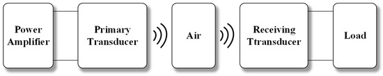 Acoustic power transfer (APT) is a newer wireless power transfer (WPT) form. Energy transmission is accomplished using sound waves as intermediate energy carriers [4,5]. As shown in Figure 1, piezoelectric transducers transform electrical energy into vibrations and continuously propagate them as pressure waves. A receiver, situated at a specific point along the wave’s path, converts the electricity back into sound energy. There are three types of medium in which it can travel: gaseous, fluid, and solid. Compared with other wireless powering techniques, such as inductive power transfer and midrange RF power transmission, acoustic power transfer (APT) has some advantages, such as lower tissue absorption, a shorter wavelength that enables more miniature transducers [6], and an increase in power intensity threshold for safe operation. The main advantage of APT is non-reliance on electromagnetic fields to transmit energy. It can be used in environments with strong electromagnetic fields.