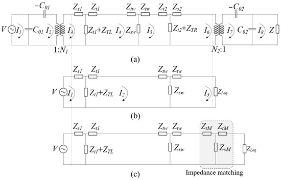 (a) Mason’s one-dimensional equivalent circuit; (b) simplified diagram of Mason’s one-dimensional equivalent circuit; (c) Mason’s one-dimensional equivalent circuit with impedance matching.