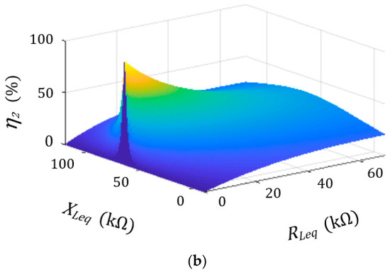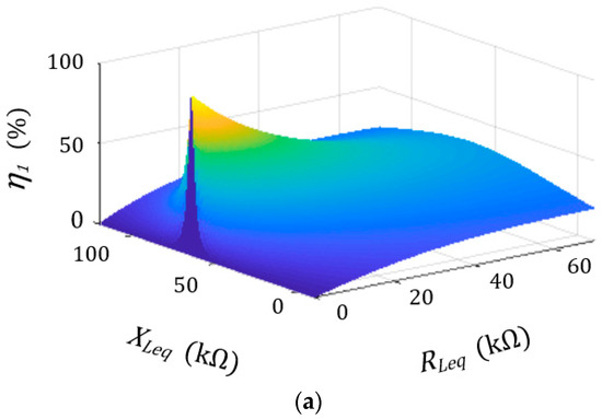 From the derivation of Mason equation, it was discovered that there exists a minor difference in the system performance between Equations (1) and (5). Observing the simulation verification in Figure 4, Figure 4a is Equation (1) and Figure 4b is Equation (5). The imaginary part and real part of the matching impedance will appear at the peak point of the figure. The value of imaginary part and the real part of the impedance matching of Equation (1) and simplified Equation (5) are almost identical, as is shown in Equation (6). In addition, it shows that impedance matching is indeed effective in improving system performance and can be calculated via circuit simplification, thereby reducing the amount of calculation.