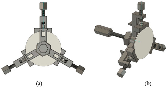 During this research, it was observed that the location of the fixed piezoelectric transducer influenced the vibration modes, which consequently impacted the impedance characteristics of the piezoelectric transducer. The traditional method is to fix the back of the piezoelectric transducer. Which is to glue it with the bracket to become a non-detachable, permanently bonded system. This method has many disadvantages, such as poor adjustability and stability. It was discovered that fixing the side of the piezoelectric transducer presents an effective means of adjusting impedance matching; however, this approach is scarcely mentioned in the existing literature. Even studies on detachable fixtures are focused on metals or solid media and mainly target the backside of the piezoelectric transducer, with no research on the side fixation, as is shown in Table 3. Therefore, this study demonstrates high innovation and practical applicability. A peripheral clamp consisting of three claws was proposed. The angle between each claw is 120 degrees, and the width of each claw corresponds to 30 degrees, as shown in Figure 6. This is a detachable clamp that can be adjusted for tightness, convenient, and flexible. A further advantage of the peripheral clamp is that they are all made using 3D printing, which reduces the price considerably.