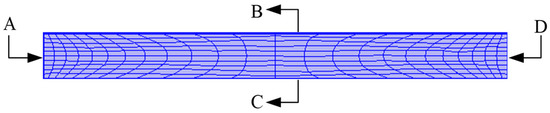 In order to reduce the calculation, a 2D axisymmetric model was used for the simulation. A model of the mesh is shown in Figure 7. A represents the axis of symmetry, B is the input voltage side, C is the ground side, and D represents the fixed constraint. Ultrasonic waves are generated by applying a voltage to a piezoelectric transducer. Therefore, the boundary conditions must be considered simultaneously, as the mechanical and electrical parts are related to the vibration applied to the piezoelectric transducer in the simulation. Table 4 lists the settings of its boundary conditions. In addition, we have not set up any additional air damping and only accounted for the losses in the materials.