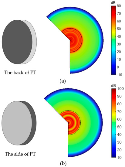 Total sound pressure level distribution of piezoelectric transducer. (a) Fixed piezo back; (b) fixed piezo side.