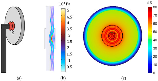 The model of the piezoelectric transducer with a free state is built in COMSOL, as shown in Figure 9. It is the distribution of its total sound pressure level. In this context, we need to emphasize the “free state.” Due to the inability of the piezoelectric transducer to float in the air without any support, we applied fixed constraints in the COMSOL model. However, compared with the constraint areas on the back and sides mentioned in the paper, the constraint area in the no-clamp model is negligible. It is found that the energy of the transmitting piezoelectric transducer is almost diffused to the surroundings when the piezoelectric transducer is in a free state, and there is not much sound pressure transmitted to the receiver. This situation poses significant challenges to efficient energy transmission within the system. Therefore, the design of the fixture is very important.