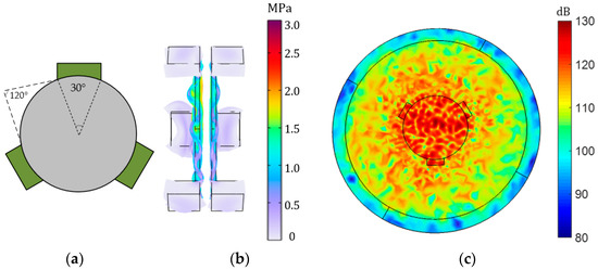 A novel detachable clamp is designed in which the fixed position is on the side of the piezoelectric transducer, as shown in Figure 11a. The peripheral clamp has a total of three claws. The angle between each claw is 120 degrees, and the width of each claw corresponds to 30 degrees. The model of the peripheral clamp is established in COMSOL, and an input voltage of 8 V is added to the transmitter, and the output terminal is set to an open circuit state. The distance between the transmitter and receiver is 2 mm. The frequency is about 50 kHz. Figure 11b is the stress transformation of the piezoelectric transducer, and its peak value can reach 3 MPa. Figure 11c is the change in its sound pressure level; the maximum value can be up to 130 dB. The system performance is improved compared with the back clamp and no clamp. Noticeably, the sound pressure level has increased by nearly 50 dB.