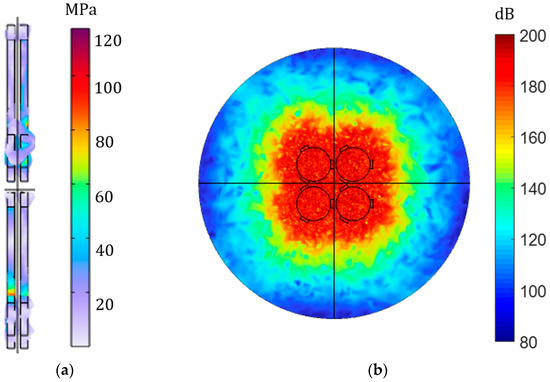Furthermore, the model in Figure 13 consists of piezoelectric transducer arrays with the same size and number of peripheral clamps. An input voltage of 8 V is applied to the transmitters, and the output is set to an open circuit state with a frequency of approximately 50 kHz. In Figure 13a, the stress transformation of the piezoelectric array with a peripheral clamp is presented with a peak value of up to 120 MPa. Figure 13b displays the change in sound pressure level, with a maximum value of 200 dB. These results are significantly higher than those of the piezoelectric array without a clamp, thus confirming the effectiveness of the clamp once again.