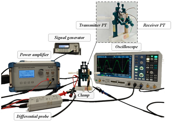 Under the condition that the resonant frequency of the system is 51.5 kHz, firstly, select the signal generator model Agilent 33250A and the ATA-122D Wide Band Amplifier as the system’s power supply; the receiving end circuit is an open circuit. The transmitting end uses a differential probe Agilent N2772A probe to detect waveform. The receiver uses an oscilloscope probe to observe the waveform. The size of the piezoelectric transducer is a circular ceramic sheet with a radius of 25 mm, and the piezoelectric material is PZT-4. The components of the clamp are all manufactured by a FLASHFORGE 3D printer, and the 3D material is PLA. An experimental diagram of the system is shown in Figure 14.