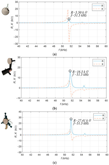 The impedance characteristics of a single piezoelectric transducer are measured in different cases, including no clamp, with a back clamp, and with a peripheral clamp. Figure 15a shows the impedance characteristic of a single piezoelectric transducer without any constraints and clamp. Figure 15b is the impedance characteristic of conditions on the back with the back clamp of a single piezoelectric transducer. Figure 15c is the impedance characteristic of a single piezoelectric transducer with constraints on its sides with the peripheral clamp. The Agilent E4980A Precision LCR Meter is used to measure the impedance of the piezoelectric transducer. The resonant frequency of a single piezoelectric transducer is 51.5 kHz, and its real resistance is 5.5 kΩ. The resonance frequency of the piezoelectric transducer fixed on the back is 51.5 kHz, and its real resistance is 16.3 kΩ; The resonance frequency of the piezoelectric transducer fixed on the side is 51.5 kHz, and its real resistance is 27.41 kΩ. According to the measurement results, the piezoelectric transducer’s resistance is higher when using fixed constraints and a clamp, especially when the constraints with the peripheral clamp are added on the side. According to Equation (14), P is the sound pressure, Z is the acoustic impedance, and c is the volume velocity. When c is constant, the impedance is higher and the sound pressure is stronger.