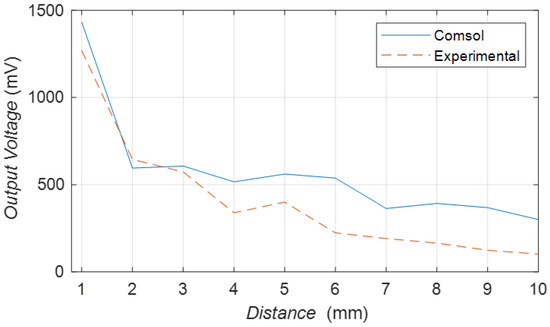 As shown in Figure 16, the red line is the experimental data about the relationship between the output voltage and the distance between the transmitter and receiver. The blue line is the simulation data about the relationship between the output voltage and the distance between the transmitter and receiver. These data were obtained under uniform conditions. The transmitter adds an input voltage of 8 V and sets the output to an open circuit state. The frequency is about 50 kHz. The trends of these two sets of values are very similar, with decreasing output voltage as distance increases. This result validates the simulation model.
