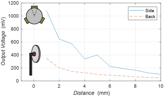The experiment compared the relationship between different distances and the output voltage with two additional clamps, as shown in Figure 17. The clamp that fixed the piezoelectric transducer on the back is a cylinder with a radius of 8 mm. The clamp that set the side of the piezoelectric transducer is distributed in an equilateral triangle with a fixed angle of 30 degrees. The distance between the transmitter and receiver is from 1 mm to 10 mm. An input voltage of 8 V is applied to the transmitters, and the output is set to an open circuit state with a frequency of approximately 50 kHz.