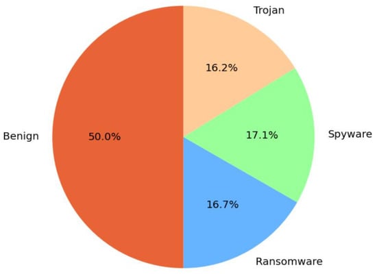 Figure 2 shows the class distribution between benign and attack family categories in CIC-Malmem-2022, which comprises 50% Benign Samples, 16.7% of Obfuscated Ransomware, 17.1% Spyware and 16.2% Trojan malware.