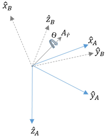 This is presented graphically in Figure 2, where the mutually orthogonal unit vectors , , and , , define the main reference frame axes A and B, respectively [41].
